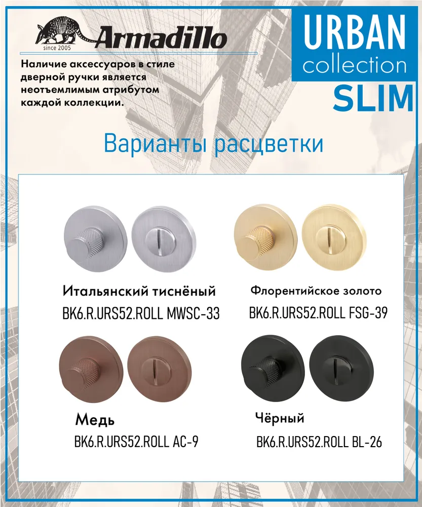 Завёртки поворотные на тонком основании идеально дополняют дверные ручки серии URBAN Slim Roll в аналогичных цветах.